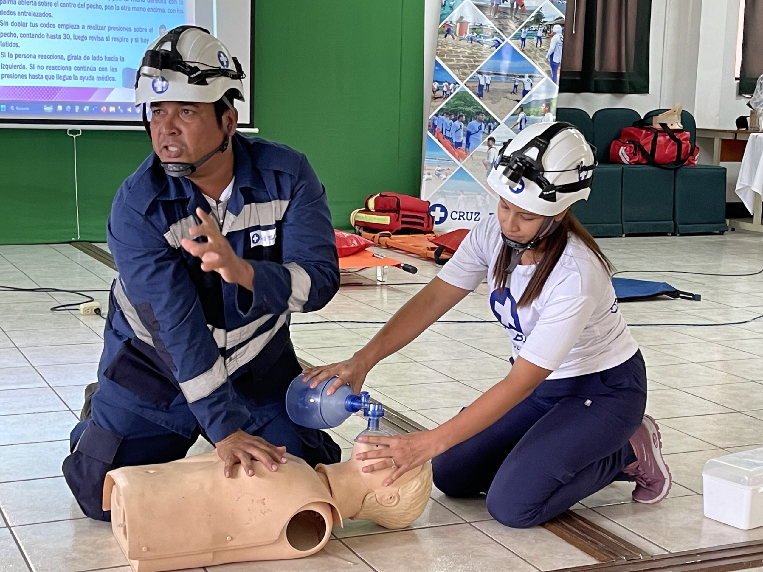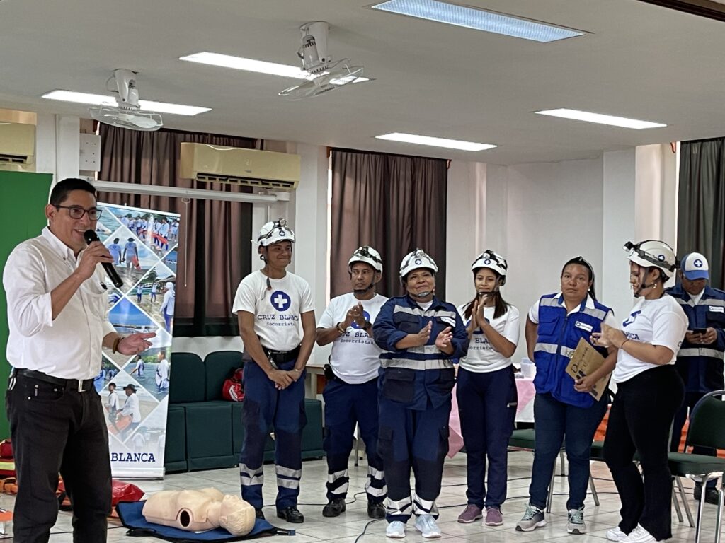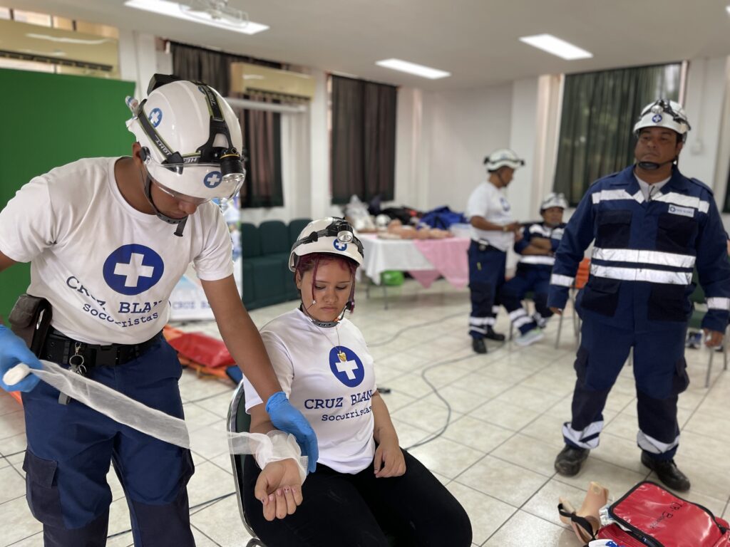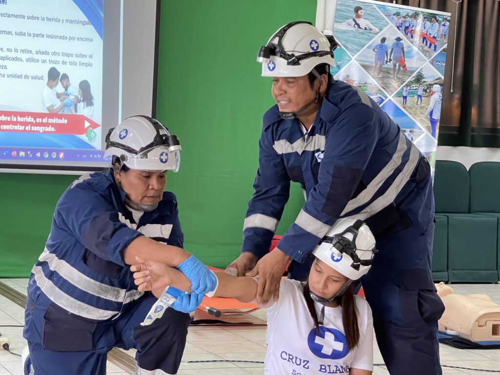 Durante la capacitación, los asistentes conocieron técnicas esenciales como la reanimación cardiopulmonar (RCP), control de hemorragias, atención de quemaduras, entre otras. La metodología se desarrolló de forma práctica, con demostraciones claras y guiadas por profesionales de la Cruz Blanca.