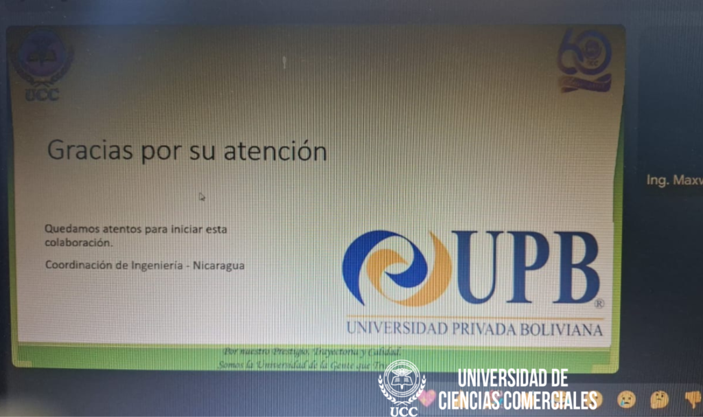 La Universidad de Ciencias Comerciales (UCC), Campus León, a través de la Coordinación de Ingeniería Civil e Ingeniería Industrial, desarrolló el pasado 4 de febrero una serie de reuniones virtuales de carácter académico internacional con universidades privadas de la región, con el objetivo de fortalecer la cooperación interinstitucional y promover la innovación en los procesos de enseñanza–aprendizaje.